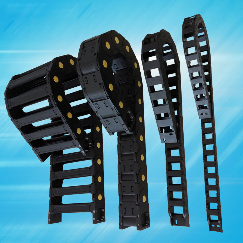 (3)單元鏈節(jié)由左右鏈板和上下檔板(橋式)或蓋板(全封閉式)組成,拖鏈每節(jié)都能打開,裝拆方便,不必穿線,打開蓋板后即可把電纜、油管、氣管、水管等放入拖鏈。